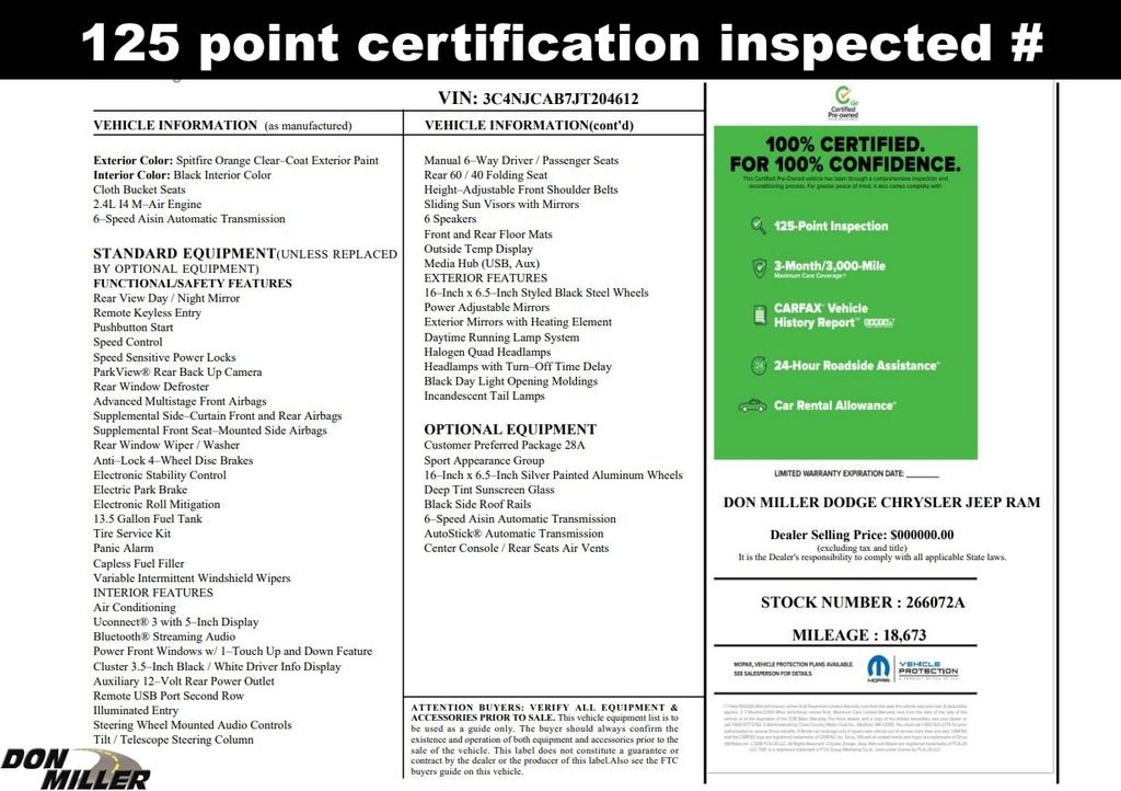 125 point certification inspected, Fresh oil change, Air Conditioning, AM/FM radio, Black Side Roof Rails, Brake assist, Compass, Deep Tint Sunscreen Glass, Electronic Stability Control, Heated door mirrors, Illuminated entry, ParkView Rear Back-Up Camera, Power door mirrors, Power windows, Radio: Uconnect 3 w/5" Display, Remote keyless entry, Speed control, Sport Appearance Plus, Steering wheel mounted audio controls, Telescoping steering wheel, Tilt steering wheel, Wheels: 16" x 6.5" Silver Painted Aluminum.