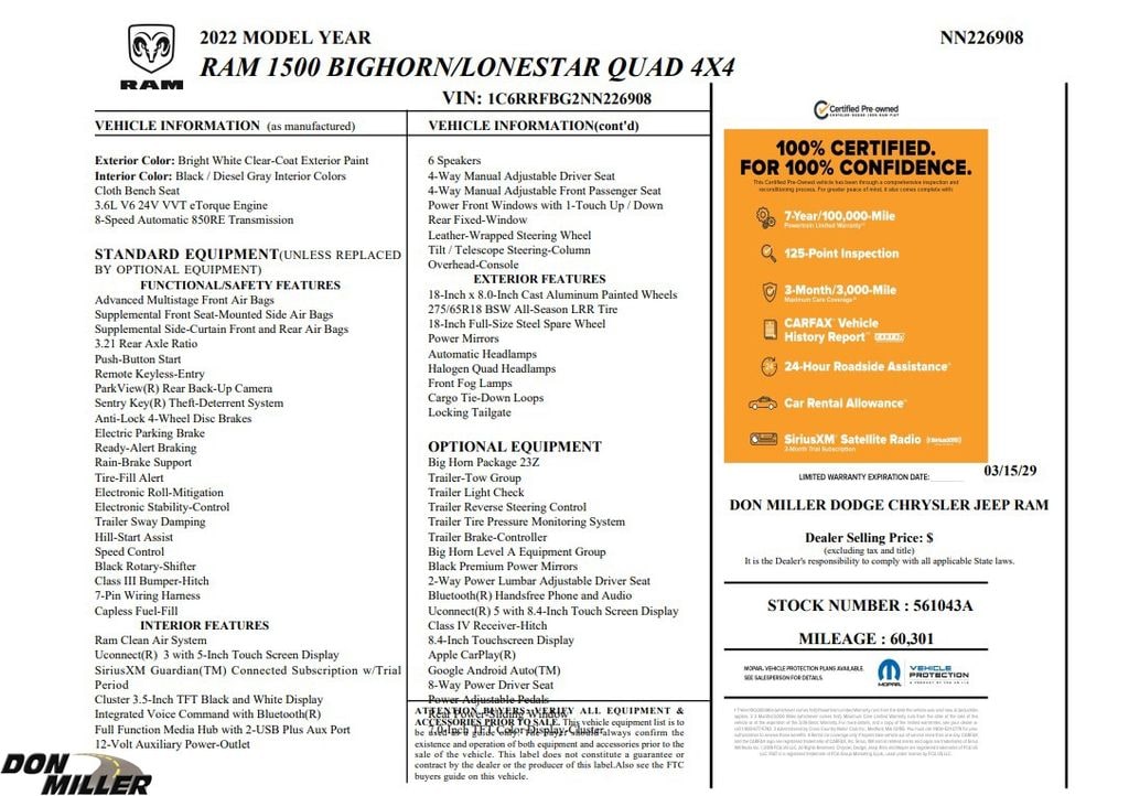 ***Apple Car Play/Google Android Auto***, 125 point certification inspected, ***Tow Package***, 4G LTE Wi-Fi Hot Spot, 8.4" Touchscreen Display, Apple CarPlay, Auto-Dimming Exterior Driver Mirror, Auto-Dimming Rear-View Mirror, Big Horn Level A Equipment Group (DISC), Black Premium Power Mirrors (GUL), Bluetooth Handsfree Phone & Audio, Class IV Receiver Hitch, Cluster 3.5" TFT Color Display, Connectivity - US/Canada, Exterior Mirrors Courtesy Lamps, Exterior Mirrors w/Supplemental Signals, Foam Bottle Insert (Door Trim Panel), For More Info, Call 800-643-2112, Glove Box Lamp, Google Android Auto, Integrated Center Stack Radio, Power 2-Way Driver Lumbar Adjust, Power 8-Way Driver Seat, Power Adjustable Pedals, Radio: Uconnect 5 W w/8.4" Display, Rear Dome w/On/Off Switch Lamp, Rear Power Sliding Window, Rear Window Defroster, SiriusXM Radio Service, SiriusXM Satellite Radio, Sun Visors w/Illuminated Vanity Mirrors, Trailer Brake Control, Trailer Light Check, Trailer Reverse Steering Control, Trailer Tire Pressure Monitoring System, Trailer Tow Group, Universal Garage Door Opener, USB Host Flip.