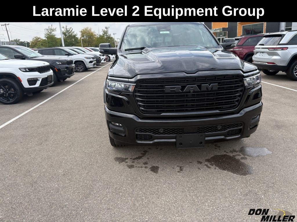 Diamond Black Crystal Pearlcoat 2026 Ram 1500 Laramie 14.4" Touchscreen Display, Active Driving Assist System, Advanced Safety Group II, Anti-Spin Differential Rear Axle, Bed Utility Group, Cluster 12" TFT Color Display, Drowsy Driver Detection, Evasive Steer Assist, Exterior 115V AC Outlet, Front Passenger Interactive Display, GPS Navigation, Heads-Up Display, Laramie Level 2 Equipment Group, MOPAR 4 Adjustable Cargo Tie-Down Hooks, Night Edition, Power Tailgate, Rain Sensitive Windshield Wipers, Sport Performance Hood, Surround View Camera System, Technology Group, Traffic Sign Recognition, Wheels: 22" x 9" Forged Aluminum.
