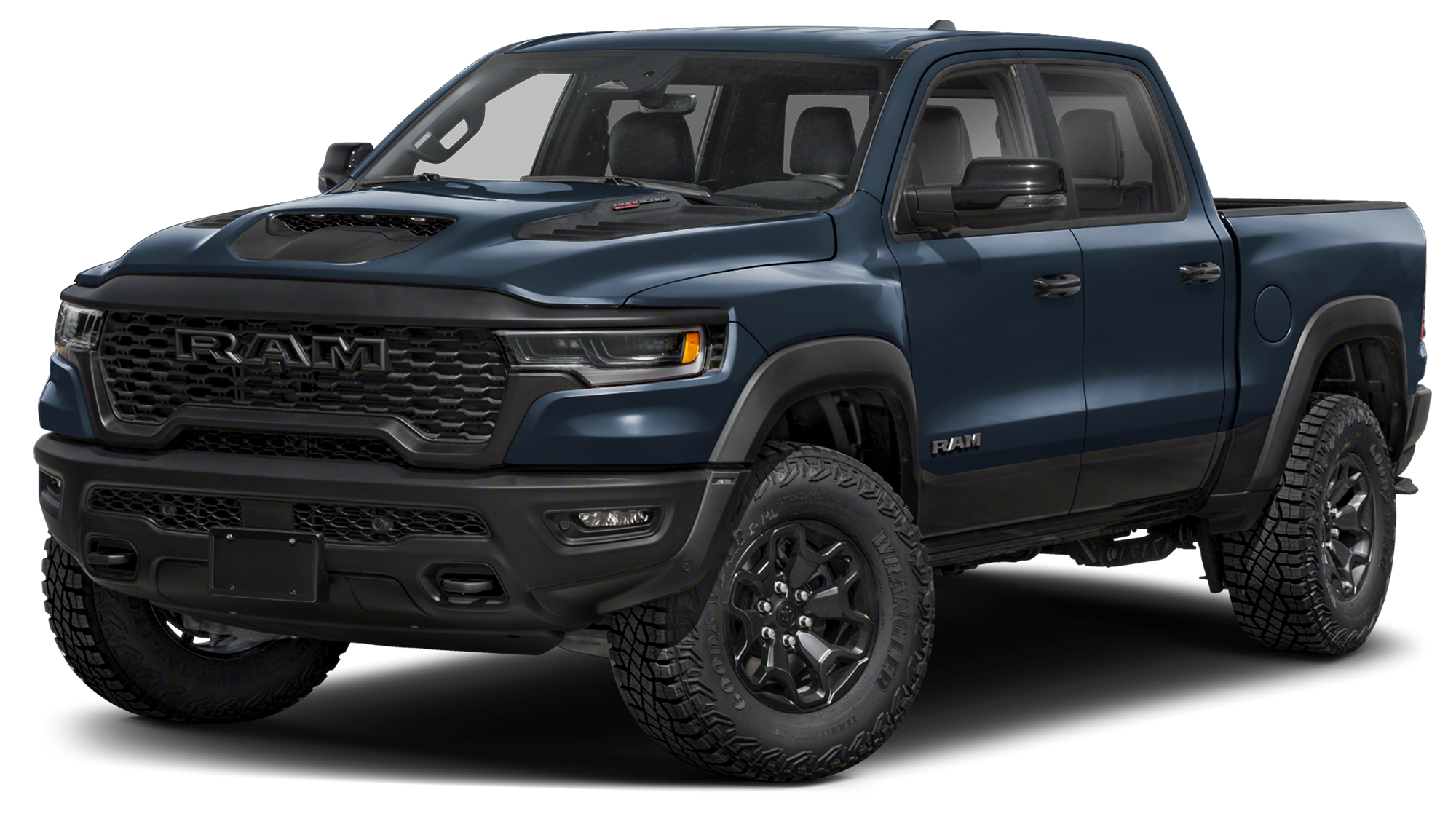 The Rebel conquers off-road challenges with an electronic locking rear differential, skid plates, raised suspension, a 33-gallon fuel tank, all-terrain tires, and available four-corner air suspension. Interior features leather/vinyl bucket seats, heated front seats, and a 12-inch navigation display.